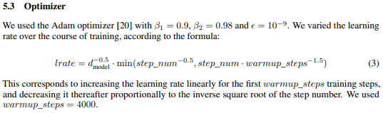 논문에서 Training Details 쪽을 보니 "We use the so-called Noam scheme to schedule the learining rate as in [22] with warmup_steps set to 4000." 이란 언급이 있었다. [22]는 "Attention is all you need" 논문이고,